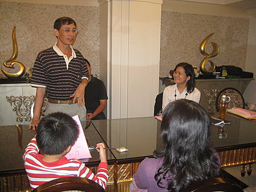 享用了可口的晚餐之後,接下來延續剛剛的「尋找有緣人」的活動。依據方才拼湊的圓,同一顏色所拼湊的家長分組進行心得分享。我們這一組中最難能可貴的是十全國小的學務處劉主任也親自蒞臨,他不只是學校主任,還是我們的家長,他不只在學校協助推動讀經,更親自以行動參與我們的親子讀經班,有他的加入對許多家長而言,更是一種鼓舞與肯定,十全國小的孩子真是有福!